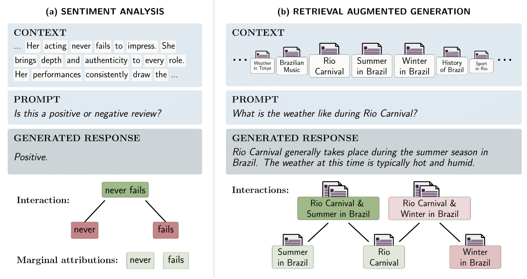 Feature attribution techniques assign importance scores to input features based on their influence on the model’s output. For example, if an LLM were used to make a medical diagnosis, this approach could identify exactly which symptoms led the model to its conclusion. While attributing importance to individual features can be valuable, the true power of sophisticated models lies in their ability to capture complex relationships between features. The figure below illustrates examples of these influential interactions: from a double negative changing sentiment (left) to the necessary synthesis of multiple documents in a RAG task (right).