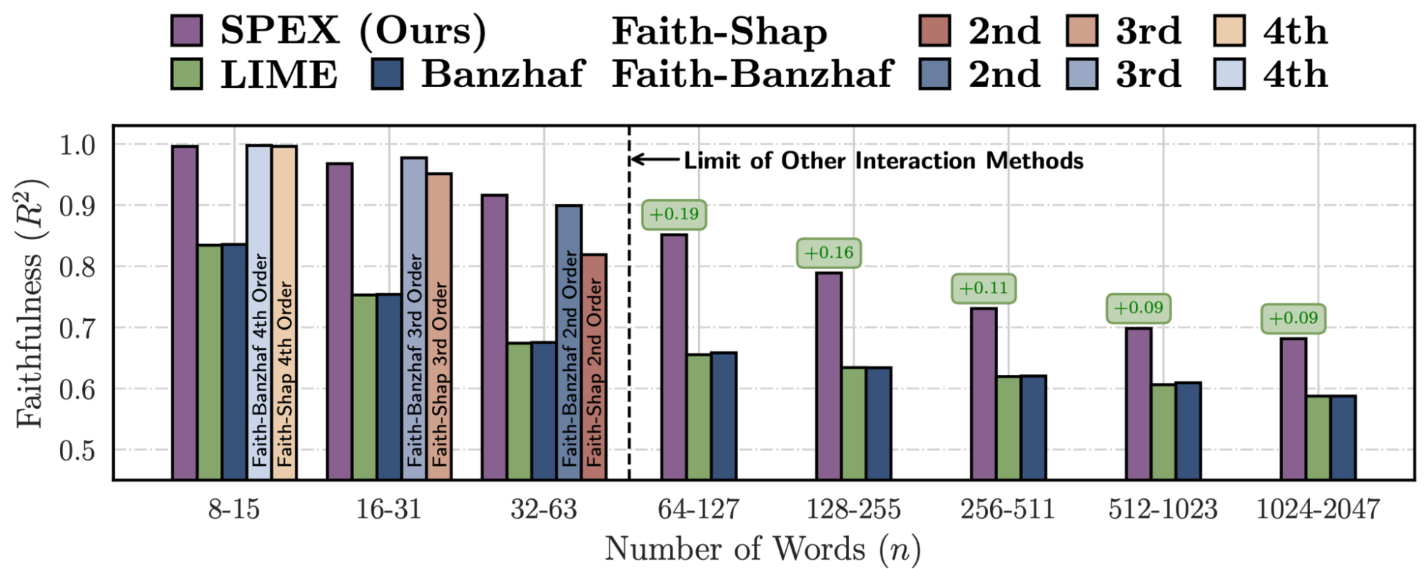 The figure below illustrates the feature attribution performance of SPEX on a sentiment analysis task. We evaluate performance using faithfulness: a measure of how accurately the recovered attributions can predict the model’s output on unseen test ablations. We find that SPEX matches the high faithfulness of existing interaction techniques (Faith-Shap, Faith-Banzhaf) on short inputs, but uniquely retains this performance as the context scales to thousands of features. In contrast, while marginal approaches (LIME, Banzhaf) can also operate at this scale, they exhibit significantly lower faithfulness because they fail to capture the complex interactions driving the model’s output.