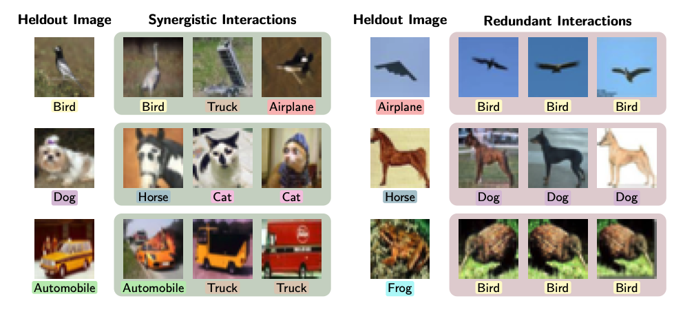 Data attribution identifies which training data points are most responsible for a model’s prediction on a new test point. Identifying influential interactions between these data points is key to explaining unexpected model behaviors. Redundant interactions, such as semantic duplicates, often reinforce specific (and possibly incorrect) concepts, while synergistic interactions are essential for defining decision boundaries that no single sample could form alone. To demonstrate this, we applied ProxySPEX to a ResNet model trained on CIFAR-10, identifying the most significant examples of both interaction types for a variety of difficult test points, as shown in the figure below.