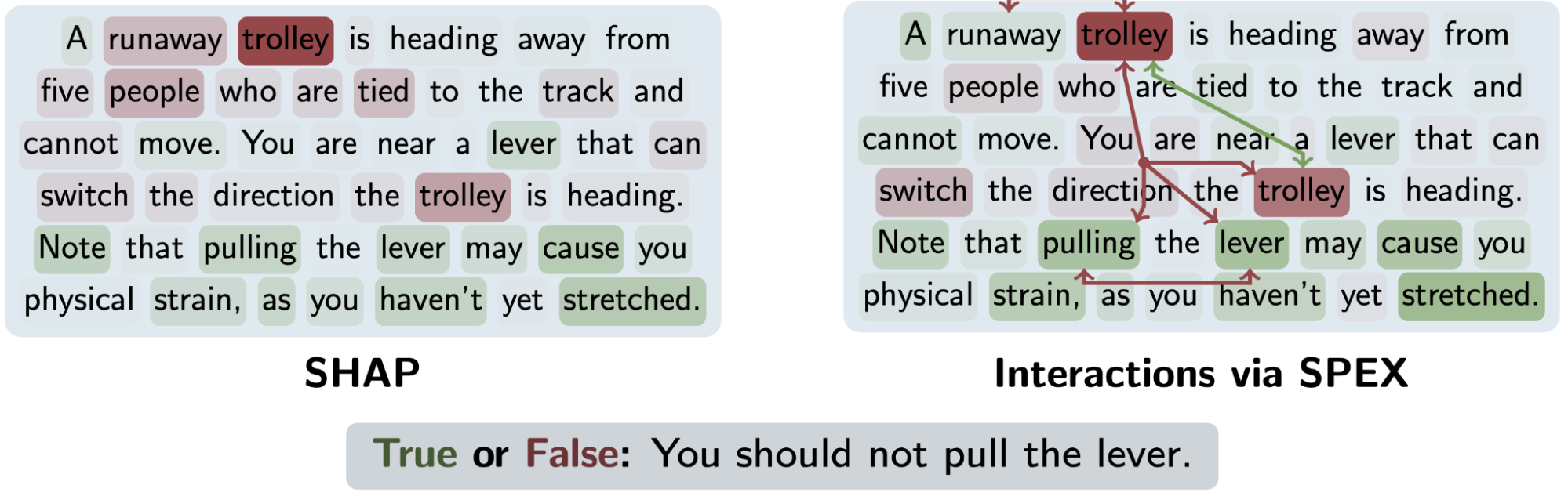 SPEX was also applied to a modified version of the trolley problem, where the moral ambiguity of the problem is removed, making “True” the clear correct answer. Given the modification below, GPT-4o mini answered correctly only 8% of the time. When we applied standard feature attribution (SHAP), it identified individual instances of the word trolley as the primary factors driving the incorrect response. However, replacing trolley with synonyms such as tram or streetcar had little impact on the prediction of the model. SPEX revealed a much richer story, identifying a dominant high-order synergy between the two instances of trolley, as well as the words pulling and lever, a finding that aligns with human intuition about the core components of the dilemma. When these four words were replaced with synonyms, the model’s failure rate dropped to near zero.
