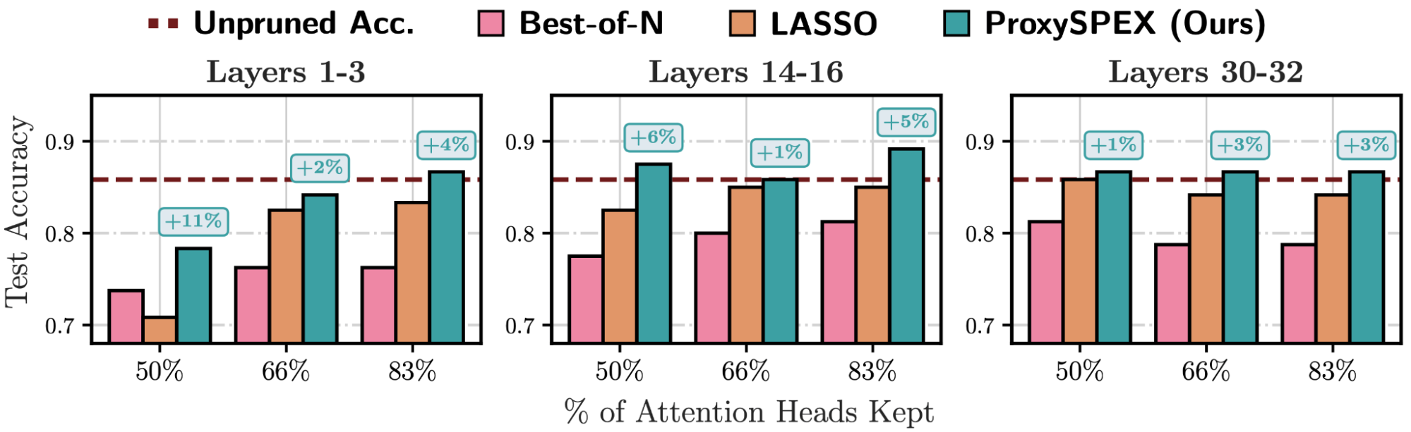 The goal of model component attribution is to identify which internal parts of the model, such as specific layers or attention heads, are most responsible for a particular behavior. Here too, ProxySPEX uncovers the responsible interactions between different parts of the architecture. Understanding these structural dependencies is vital for architectural interventions, such as task-specific attention head pruning. On an MMLU dataset (highschool‐us‐history), we demonstrate that a ProxySPEX-informed pruning strategy not only outperforms competing methods, but can actually improve model performance on the target task.