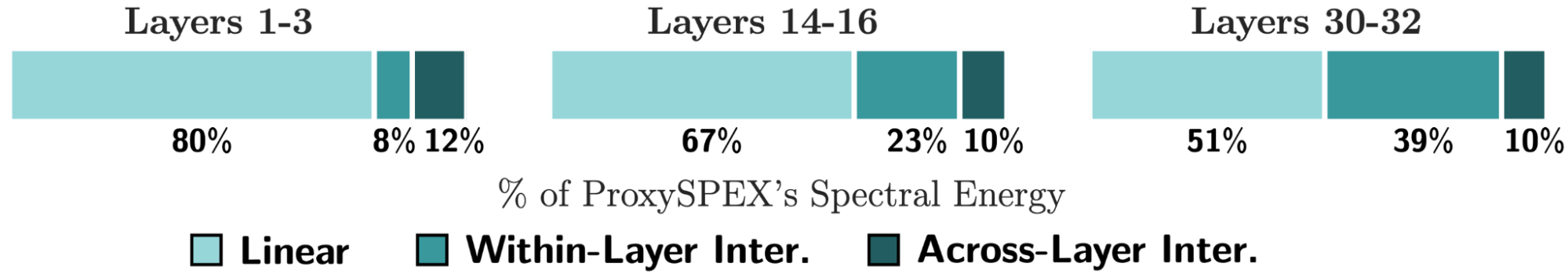 On this task, we also analyzed the interaction structure across the model’s depth. We observe that early layers function in a predominantly linear regime, where heads contribute largely independently to the target task. In later layers, the role of interactions between attention heads becomes more pronounced, with most of the contribution coming from interactions among heads in the same layer.