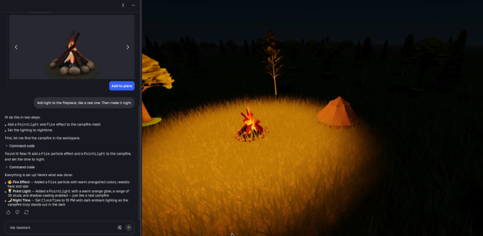 For example, creators can ask Assistant to generate a campfire, then add light to make it more realistic, and then set the scene at night.